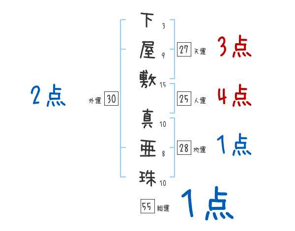 天運![]() | 下屋敷真亜珠さんの天運は27画の3つ星!頭脳明晰だが強情で摩擦が多い傾向。孤立に注意。 家系が持つ宿命的な運勢を表します。祖先から受け継いだ苗字ですので自分の力が及びません。家柄を象徴します。 |