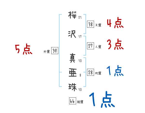 外運![]() | 桜沢真亜珠さんの外運は39画の5つ星!社交性に優れ人望が厚い。人の上に立ち成功する。 生活面を象徴する運勢です。外部から受ける影響力を表し、結婚運、家庭運や職場、環境への順応性を表します。 |