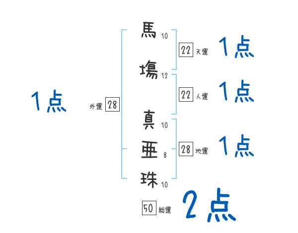 外運![]() | 馬塲真亜珠さんの外運は28画の1つ星!家庭環境に注意。スポーツで活躍できる能力があるかも。 生活面を象徴する運勢です。外部から受ける影響力を表し、結婚運、家庭運や職場、環境への順応性を表します。 |