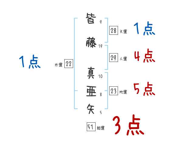 外運![]() | 皆藤真亜矢さんの外運は22画の1つ星!努力することが苦手ないっぽう手先が器用。芸術性にも優れる。 生活面を象徴する運勢です。外部から受ける影響力を表し、結婚運、家庭運や職場、環境への順応性を表します。 |