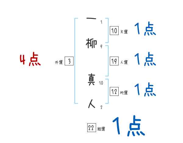 人運![]() | 一柳真人さんの人運は19画の1つ星!優れた才能を持ちますが、協調性が足りないことも。周りの人と協力する事を意識しましょう。 性格や才能などを表す2番目に重要な運勢です。人間関係や協調性、社会的な成功に影響します。主に20歳から50歳ぐらいまでの中年期の運勢を表します。 |