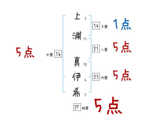 外運![]() | 上浦真伊希さんの外運は16画の5つ星!人望が厚く大きく発展する。逆転成功が見える。 生活面を象徴する運勢です。外部から受ける影響力を表し、結婚運、家庭運や職場、環境への順応性を表します。 |