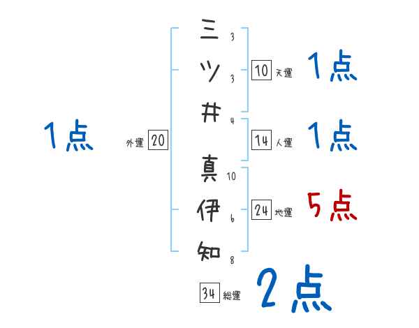 総運![]() | 三ツ井真伊知さんの総運は34画の2つ星!独創性に優れるが、自尊心が強く災難に注意しましょう。 あなたの人生を表す1番重要な運勢です。生涯を通じて影響する総合運となり、主に50歳以降の晩年期に影響を及ぼします。 |