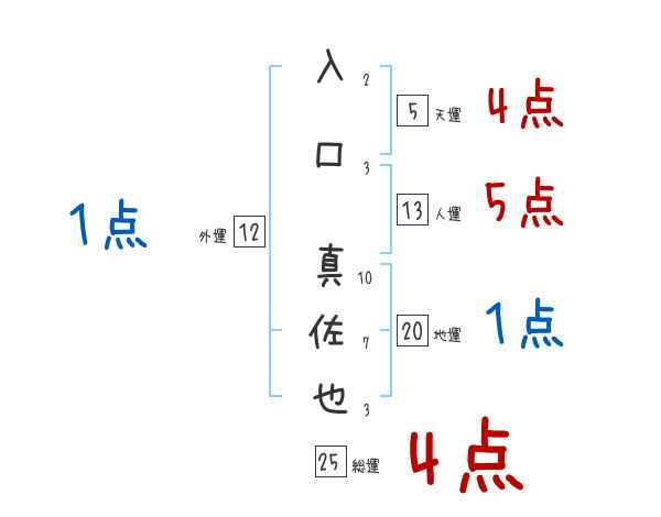 天運![]() | 入口真佐也さんの天運は5画の4つ星!健康で安泰。協調性に優れ、財産に恵まれる。 家系が持つ宿命的な運勢を表します。祖先から受け継いだ苗字ですので自分の力が及びません。家柄を象徴します。 |