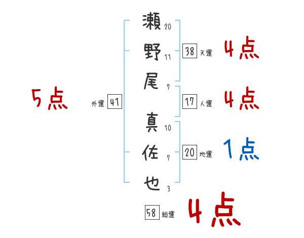 総運![]() | 瀬野尾真佐也さんの総運は58画の4つ星!安定した生活。大器晩成タイプ。 あなたの人生を表す1番重要な運勢です。生涯を通じて影響する総合運となり、主に50歳以降の晩年期に影響を及ぼします。 |
