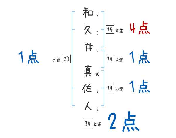 総運![]() | 和久井真佐人さんの総運は34画の2つ星!独創性に優れるが、自尊心が強く災難に注意しましょう。 あなたの人生を表す1番重要な運勢です。生涯を通じて影響する総合運となり、主に50歳以降の晩年期に影響を及ぼします。 |