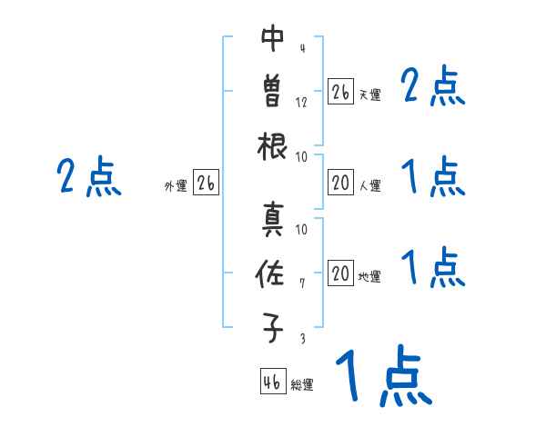 総運![]() | 中曽根真佐子さんの総運は46画の1つ星!迷走することが多く苦労するかも。目先のことにとらわれないように。 あなたの人生を表す1番重要な運勢です。生涯を通じて影響する総合運となり、主に50歳以降の晩年期に影響を及ぼします。 |