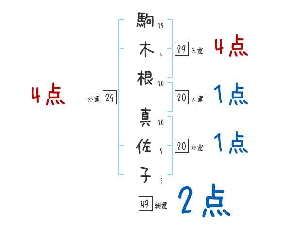 外運![]() | 駒木根真佐子さんの外運は29画の4つ星!完全主義で才能がある。厳格な心の持ち主。 生活面を象徴する運勢です。外部から受ける影響力を表し、結婚運、家庭運や職場、環境への順応性を表します。 |