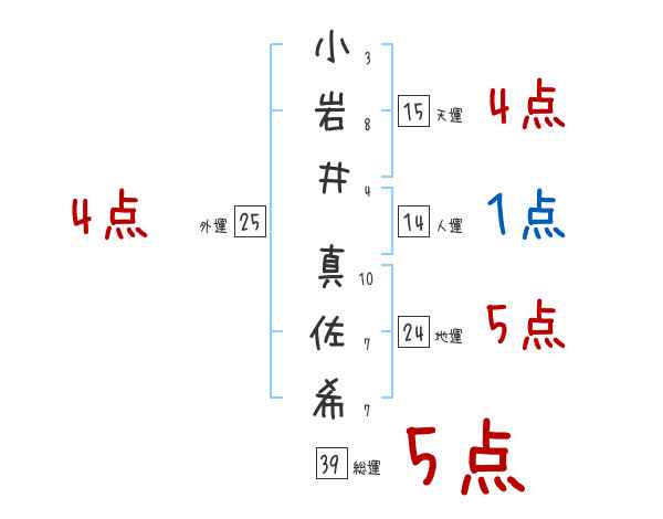 総運![]() | 小岩井真佐希さんの総運は39画の5つ星!社交性に優れ人望が厚い。人の上に立ち成功する。 あなたの人生を表す1番重要な運勢です。生涯を通じて影響する総合運となり、主に50歳以降の晩年期に影響を及ぼします。 |