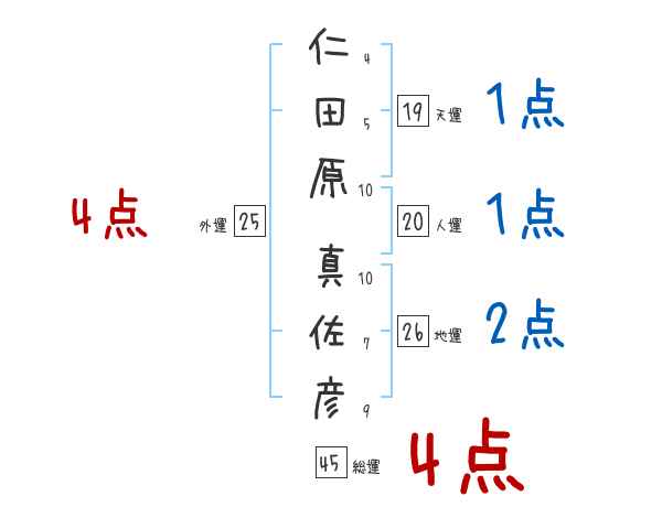 外運![]() | 仁田原真佐彦さんの外運は25画の4つ星!個性があり才能があふれる。強運の持ち主で発展する。 生活面を象徴する運勢です。外部から受ける影響力を表し、結婚運、家庭運や職場、環境への順応性を表します。 |