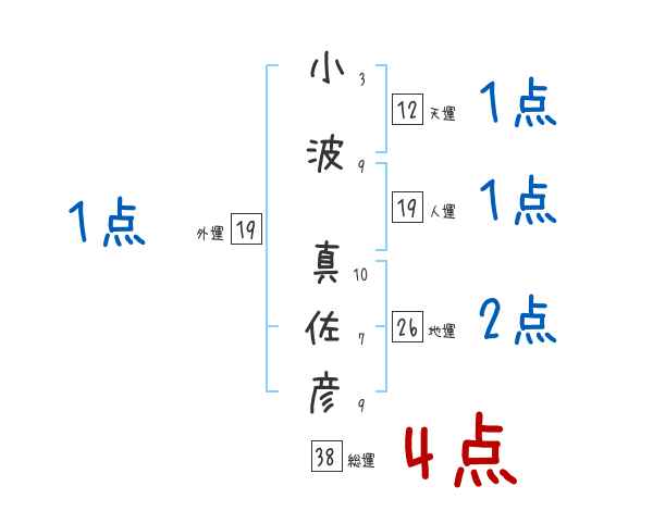 外運![]() | 小波真佐彦さんの外運は19画の1つ星!優れた才能を持ちますが、協調性が足りないことも。周りの人と協力する事を意識しましょう。 生活面を象徴する運勢です。外部から受ける影響力を表し、結婚運、家庭運や職場、環境への順応性を表します。 |