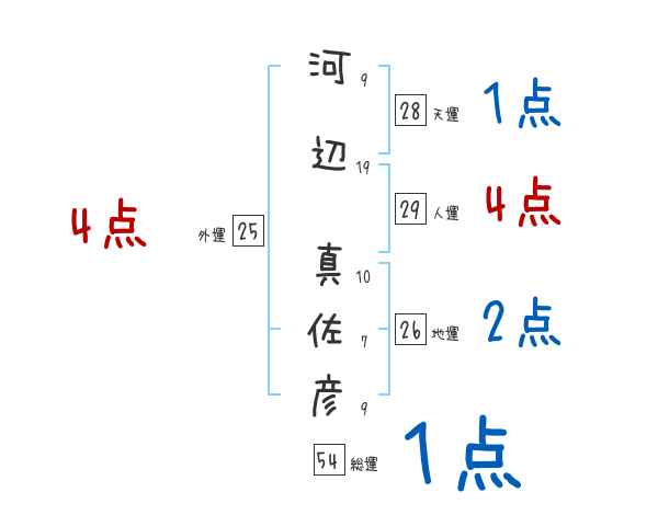 総運![]() | 河辺真佐彦さんの総運は54画の1つ星!トラブルが多いかも。周りをよく見て協調して過ごしましょう。 あなたの人生を表す1番重要な運勢です。生涯を通じて影響する総合運となり、主に50歳以降の晩年期に影響を及ぼします。 |
