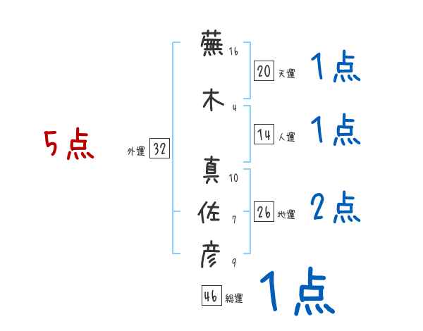 外運![]() | 蕪木真佐彦さんの外運は32画の5つ星!柔軟性があり成功する。チャンスが多く金運が良い。 生活面を象徴する運勢です。外部から受ける影響力を表し、結婚運、家庭運や職場、環境への順応性を表します。 |