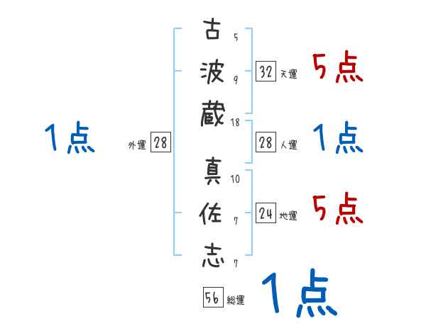 天運![]() | 古波蔵真佐志さんの天運は32画の5つ星!柔軟性があり成功する。チャンスが多く金運が良い。 家系が持つ宿命的な運勢を表します。祖先から受け継いだ苗字ですので自分の力が及びません。家柄を象徴します。 |