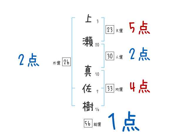 人運![]() | 上瀬真佐樹さんの人運は30画の2つ星!浮き沈みの激しさに注意しましょう。 性格や才能などを表す2番目に重要な運勢です。人間関係や協調性、社会的な成功に影響します。主に20歳から50歳ぐらいまでの中年期の運勢を表します。 |