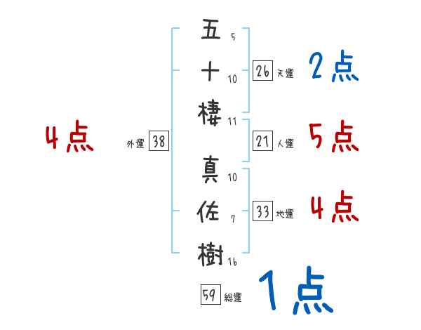 外運![]() | 五十棲真佐樹さんの外運は38画の4つ星!温厚な性格で技術的な才能を発揮する。職人的な仕事に向いている。 生活面を象徴する運勢です。外部から受ける影響力を表し、結婚運、家庭運や職場、環境への順応性を表します。 |