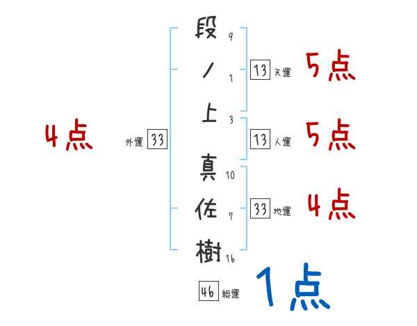 外運![]() | 段ノ上真佐樹さんの外運は33画の4つ星!権力志向でプライドが高い。勇気があり運を切り開き成功する。 生活面を象徴する運勢です。外部から受ける影響力を表し、結婚運、家庭運や職場、環境への順応性を表します。 |