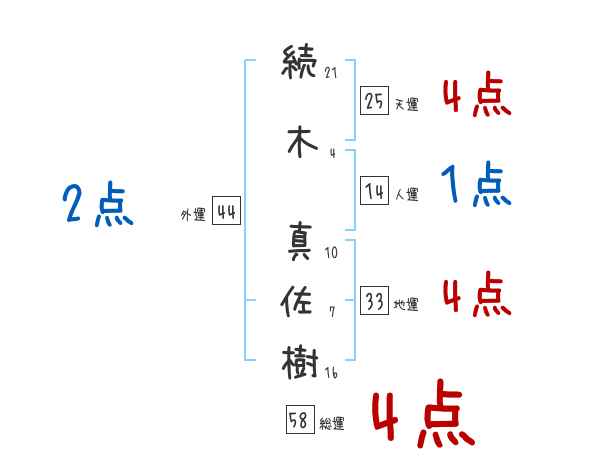 総運![]() | 続木真佐樹さんの総運は58画の4つ星!安定した生活。大器晩成タイプ。 あなたの人生を表す1番重要な運勢です。生涯を通じて影響する総合運となり、主に50歳以降の晩年期に影響を及ぼします。 |