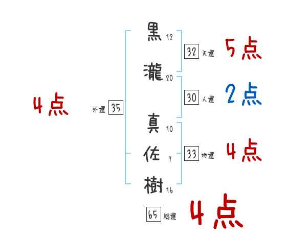 天運![]() | 黒瀧真佐樹さんの天運は32画の5つ星!柔軟性があり成功する。チャンスが多く金運が良い。 家系が持つ宿命的な運勢を表します。祖先から受け継いだ苗字ですので自分の力が及びません。家柄を象徴します。 |