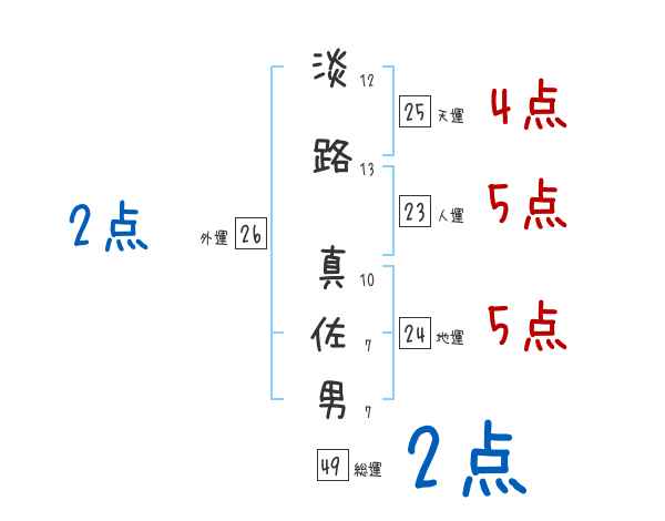 天運![]() | 淡路真佐男さんの天運は25画の4つ星!個性があり才能があふれる。強運の持ち主で発展する。 家系が持つ宿命的な運勢を表します。祖先から受け継いだ苗字ですので自分の力が及びません。家柄を象徴します。 |