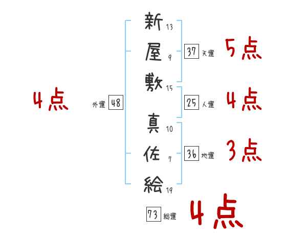 総運![]() | 新屋敷真佐絵さんの総運は73画の4つ星!天徳のある人生。散財に注意すれば晩年幸福。 あなたの人生を表す1番重要な運勢です。生涯を通じて影響する総合運となり、主に50歳以降の晩年期に影響を及ぼします。 |