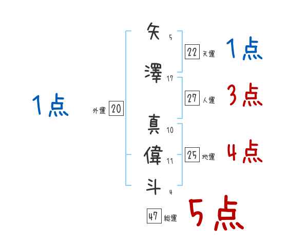 総運![]() | 矢澤真偉斗さんの総運は47画の5つ星!実力が開花し発展する円満な人生。財に恵まれる。 あなたの人生を表す1番重要な運勢です。生涯を通じて影響する総合運となり、主に50歳以降の晩年期に影響を及ぼします。 |