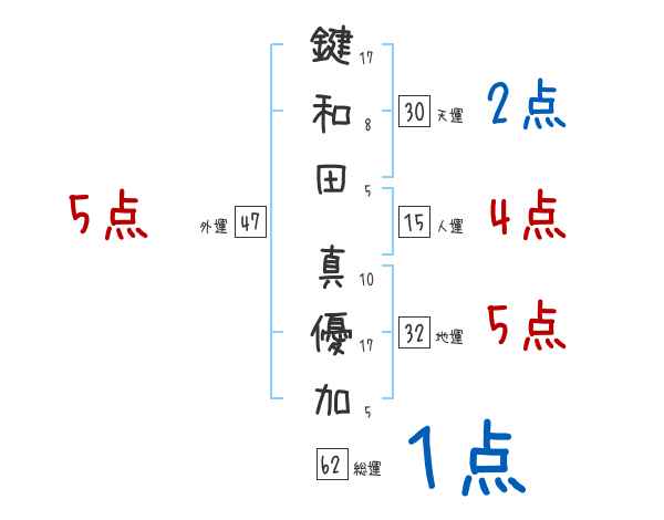 外運![]() | 鍵和田真優加さんの外運は47画の5つ星!実力が開花し発展する円満な人生。財に恵まれる。 生活面を象徴する運勢です。外部から受ける影響力を表し、結婚運、家庭運や職場、環境への順応性を表します。 |