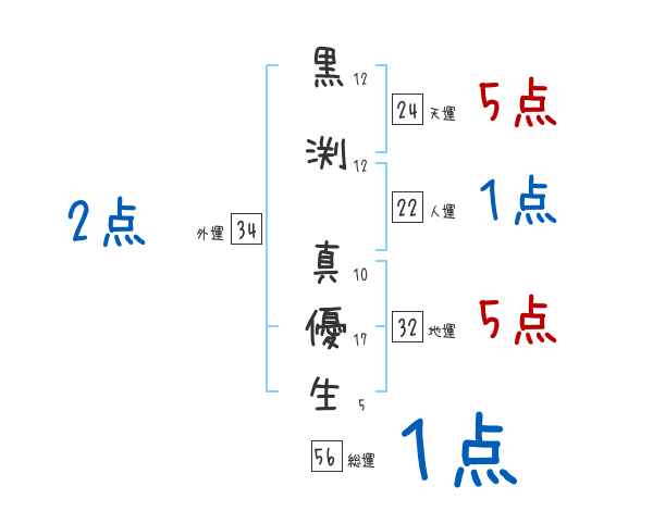 外運![]() | 黒渕真優生さんの外運は34画の2つ星!独創性に優れるが、自尊心が強く災難に注意しましょう。 生活面を象徴する運勢です。外部から受ける影響力を表し、結婚運、家庭運や職場、環境への順応性を表します。 |