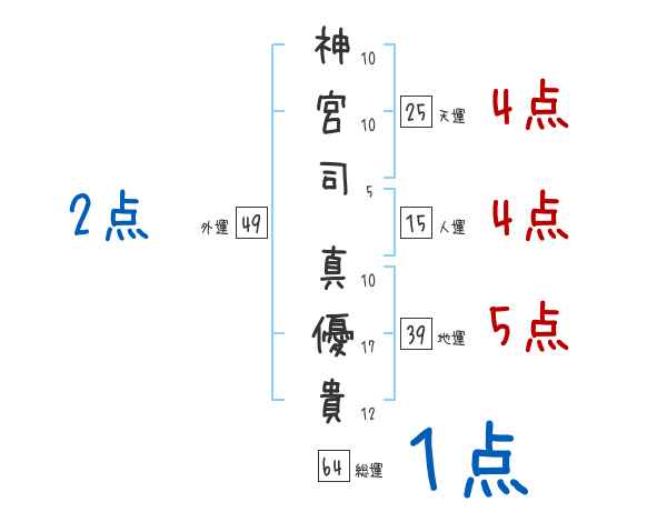 人運![]() | 神宮司真優貴さんの人運は15画の4つ星!人徳があり出世する。順調に物事を進め円満な人生。 性格や才能などを表す2番目に重要な運勢です。人間関係や協調性、社会的な成功に影響します。主に20歳から50歳ぐらいまでの中年期の運勢を表します。 |