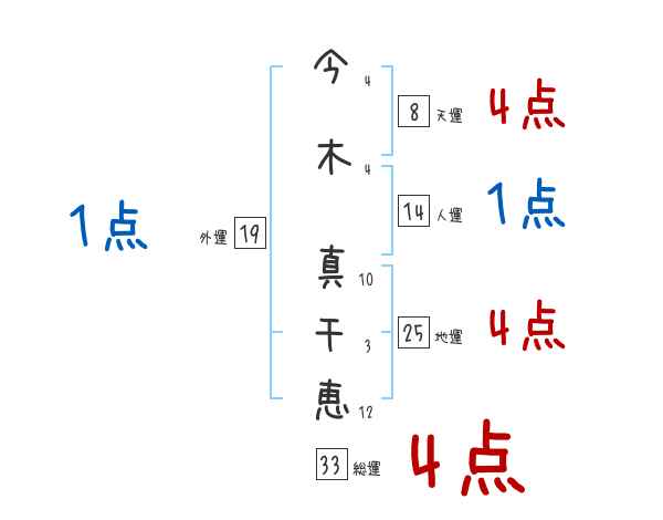 外運![]() | 今木真千恵さんの外運は19画の1つ星!優れた才能を持ちますが、協調性が足りないことも。周りの人と協力する事を意識しましょう。 生活面を象徴する運勢です。外部から受ける影響力を表し、結婚運、家庭運や職場、環境への順応性を表します。 |