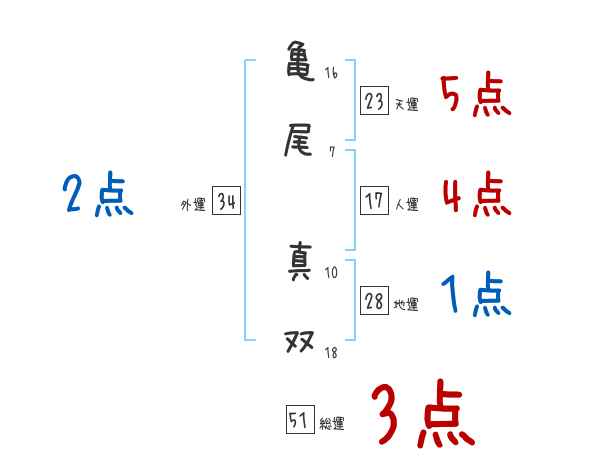 外運![]() | 亀尾真双さんの外運は34画の2つ星!独創性に優れるが、自尊心が強く災難に注意しましょう。 生活面を象徴する運勢です。外部から受ける影響力を表し、結婚運、家庭運や職場、環境への順応性を表します。 |