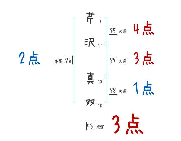 総運![]() | 芹沢真双さんの総運は53画の3つ星!やや見栄っ張りで虚栄心がある。散財に注意。 あなたの人生を表す1番重要な運勢です。生涯を通じて影響する総合運となり、主に50歳以降の晩年期に影響を及ぼします。 |