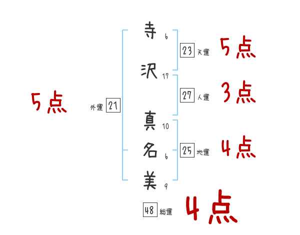 外運![]() | 寺沢真名美さんの外運は21画の5つ星!統率力がある。独立し成功する。名誉を手に入れる。 生活面を象徴する運勢です。外部から受ける影響力を表し、結婚運、家庭運や職場、環境への順応性を表します。 |