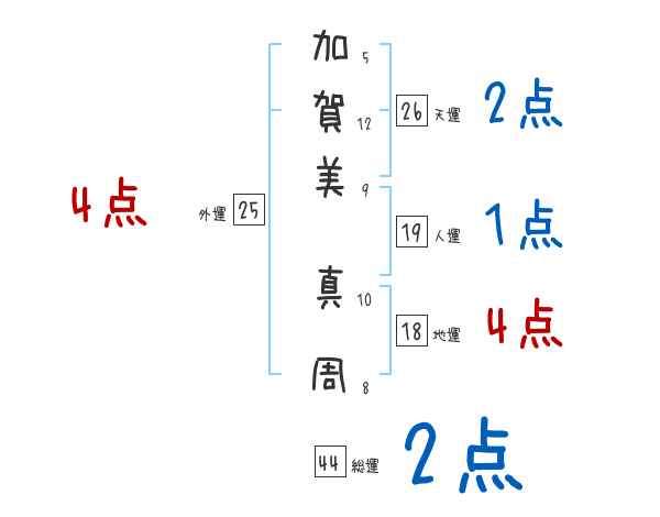 天運![]() | 加賀美真周さんの天運は26画の2つ星!波瀾万丈かも。信頼できる人を大事にしましょう。 家系が持つ宿命的な運勢を表します。祖先から受け継いだ苗字ですので自分の力が及びません。家柄を象徴します。 |