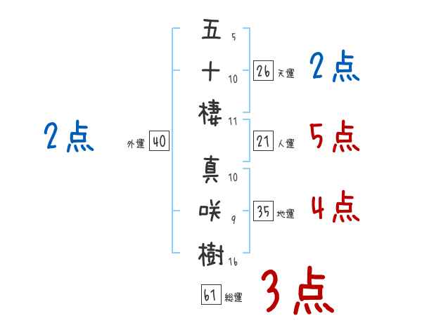 人運![]() | 五十棲真咲樹さんの人運は21画の5つ星!統率力がある。独立し成功する。名誉を手に入れる。 性格や才能などを表す2番目に重要な運勢です。人間関係や協調性、社会的な成功に影響します。主に20歳から50歳ぐらいまでの中年期の運勢を表します。 |