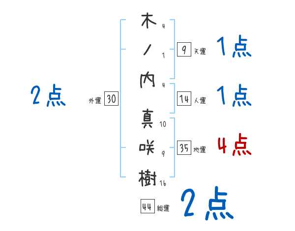 天運![]() | 木ノ内真咲樹さんの天運は9画の1つ星!消極的で才能を発揮することが苦手なことも。周りの意見に耳を傾けましょう。 家系が持つ宿命的な運勢を表します。祖先から受け継いだ苗字ですので自分の力が及びません。家柄を象徴します。 |