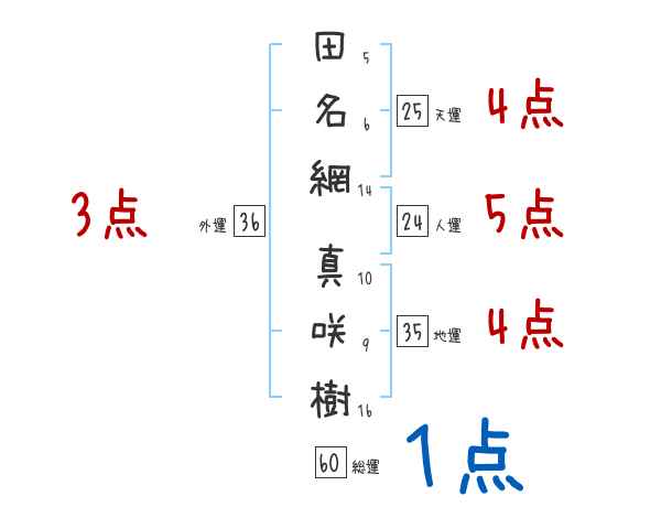 人運![]() | 田名網真咲樹さんの人運は24画の5つ星!家庭運が良く順調な人生。金運にも恵まれる。 性格や才能などを表す2番目に重要な運勢です。人間関係や協調性、社会的な成功に影響します。主に20歳から50歳ぐらいまでの中年期の運勢を表します。 |