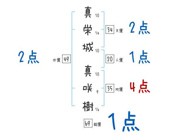 総運![]() | 真栄城真咲樹さんの総運は69画の1つ星!不満を感じやすい傾向が。ストレスを貯めないように注意しましょう。 あなたの人生を表す1番重要な運勢です。生涯を通じて影響する総合運となり、主に50歳以降の晩年期に影響を及ぼします。 |