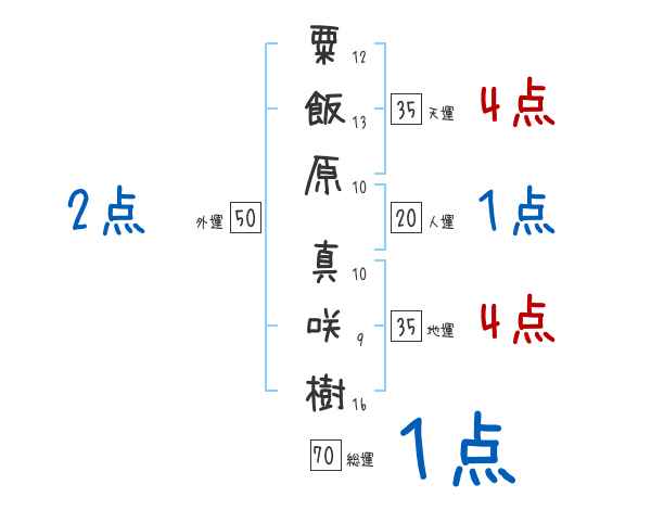 外運![]() | 粟飯原真咲樹さんの外運は50画の2つ星!浮き沈みが激しく不安定。しりすぼみに衰退しやすいので注意しましょう。 生活面を象徴する運勢です。外部から受ける影響力を表し、結婚運、家庭運や職場、環境への順応性を表します。 |