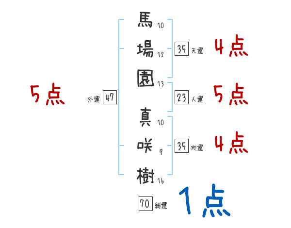 外運![]() | 馬場園真咲樹さんの外運は47画の5つ星!実力が開花し発展する円満な人生。財に恵まれる。 生活面を象徴する運勢です。外部から受ける影響力を表し、結婚運、家庭運や職場、環境への順応性を表します。 |
