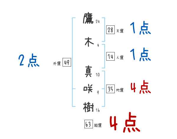 天運![]() | 鷹木真咲樹さんの天運は28画の1つ星!家庭環境に注意。スポーツで活躍できる能力があるかも。 家系が持つ宿命的な運勢を表します。祖先から受け継いだ苗字ですので自分の力が及びません。家柄を象徴します。 |