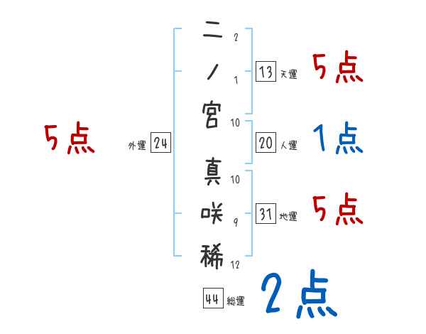 総運![]() | 二ノ宮真咲稀さんの総運は44画の2つ星!誠実で慎重な性格。物事を考えすぎないように注意しましょう。 あなたの人生を表す1番重要な運勢です。生涯を通じて影響する総合運となり、主に50歳以降の晩年期に影響を及ぼします。 |