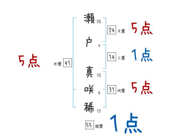 天運![]() | 瀬戸真咲稀さんの天運は24画の5つ星!家庭運が良く順調な人生。金運にも恵まれる。 家系が持つ宿命的な運勢を表します。祖先から受け継いだ苗字ですので自分の力が及びません。家柄を象徴します。 |