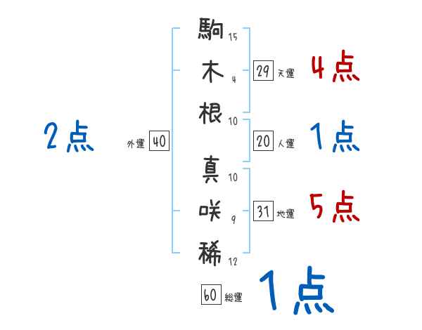 天運![]() | 駒木根真咲稀さんの天運は29画の4つ星!完全主義で才能がある。厳格な心の持ち主。 家系が持つ宿命的な運勢を表します。祖先から受け継いだ苗字ですので自分の力が及びません。家柄を象徴します。 |