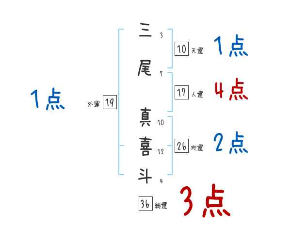 外運![]() | 三尾真喜斗さんの外運は19画の1つ星!優れた才能を持ちますが、協調性が足りないことも。周りの人と協力する事を意識しましょう。 生活面を象徴する運勢です。外部から受ける影響力を表し、結婚運、家庭運や職場、環境への順応性を表します。 |