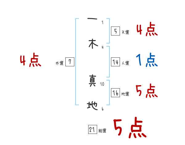 天運![]() | 一木真地さんの天運は5画の4つ星!健康で安泰。協調性に優れ、財産に恵まれる。 家系が持つ宿命的な運勢を表します。祖先から受け継いだ苗字ですので自分の力が及びません。家柄を象徴します。 |