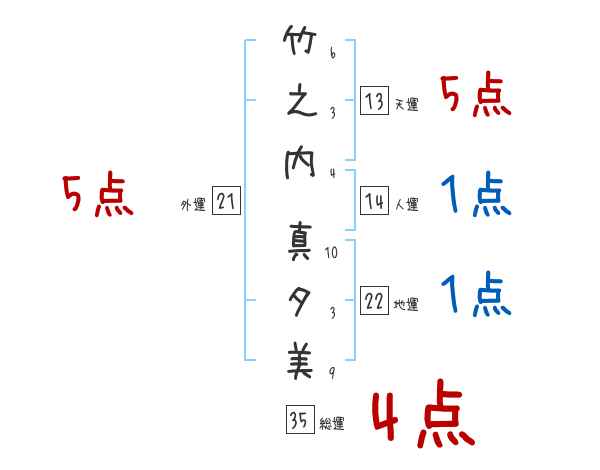 外運![]() | 竹之内真夕美さんの外運は21画の5つ星!統率力がある。独立し成功する。名誉を手に入れる。 生活面を象徴する運勢です。外部から受ける影響力を表し、結婚運、家庭運や職場、環境への順応性を表します。 |