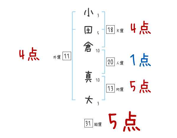 天運![]() | 小田倉真大さんの天運は18画の4つ星!情熱的で剛気。忍耐力があり信頼される。 家系が持つ宿命的な運勢を表します。祖先から受け継いだ苗字ですので自分の力が及びません。家柄を象徴します。 |