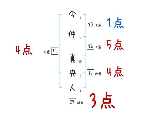 人運![]() | 今仲真央人さんの人運は16画の5つ星!人望が厚く大きく発展する。逆転成功が見える。 性格や才能などを表す2番目に重要な運勢です。人間関係や協調性、社会的な成功に影響します。主に20歳から50歳ぐらいまでの中年期の運勢を表します。 |