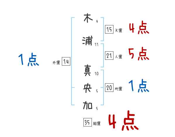 外運![]() | 木浦真央加さんの外運は14画の1つ星!人に対して優しいがストレスを溜め込みがち。人間関係のトラブルを避けるよう気をつけましょう。 生活面を象徴する運勢です。外部から受ける影響力を表し、結婚運、家庭運や職場、環境への順応性を表します。 |
